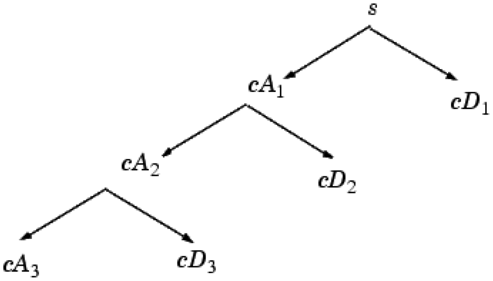 WT enables the signal (spectrum) to be analyzed as a sum of functions (wavelets) with different spatial and frequency properties. The discrete WT (DWT) has the most popular application. The generated waveforms are analyzed with wavelet multi-resolution analysis to extract sub-band information from the non-stationary signals. The signal can be constructed accurately with the wavelet analysis using relatively small numbers of components [23,24]. The discrete WT decomposition structure was shown in Figure 2.