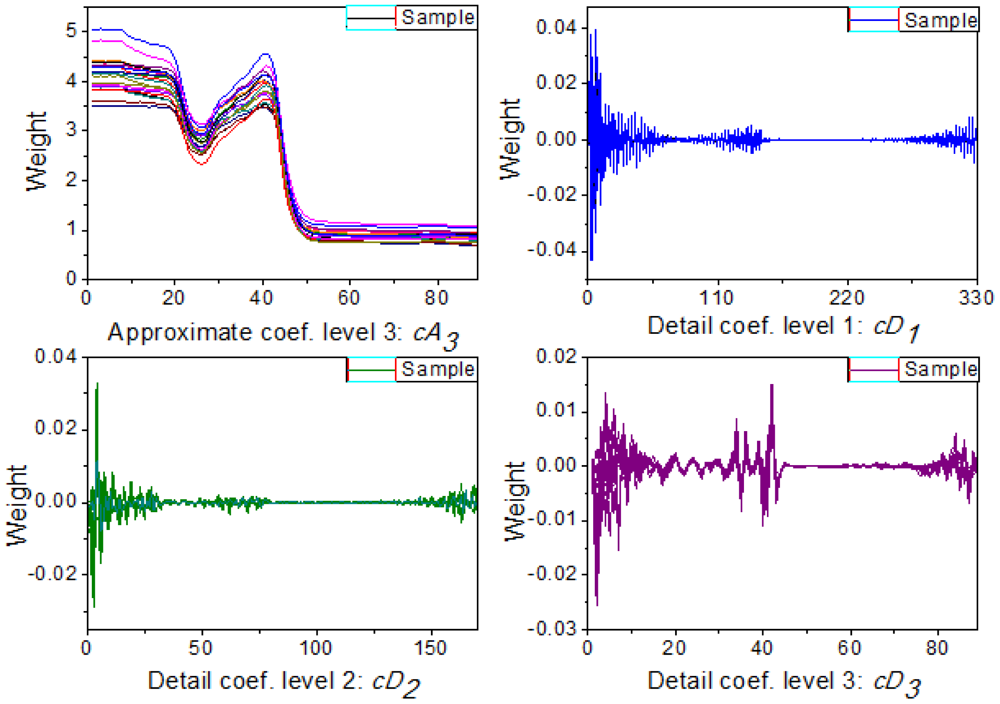 Multi-signal wavelet decomposition was realized to expose the internal structure of all the spectral data of the 738 samples. After WT, the spectrum of each sample was decomposed to four sets of wavelet coefficients, including approximation coefficients cA3 and detail coefficients cD1, cD2, cD3 as shown in Figure 3. It could be found that cA3 had the same trend with the original spectra, and it was very similar to the original spectra. While cD1, cD2, cD3 contained much high-frequency information, especially in the beginning. In order to evaluate the information contained in the four sets of wavelet coefficients in this decomposition, the percentages of energy of the four sets of wavelet coefficients were calculated. And the energy percentages of wavelet coefficients for all the 738 samples were plotted in Figure 4.