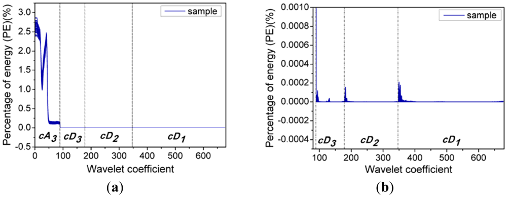 Figure 4 shows the energy distribution of the wavelet coefficients including cA3, cD1, cD2, and cD3, where it can be seen that the energy percentages of the cD1, cD2 and cD3 are very close to zero, while the wavelet coefficients of cA3 correspond to most of spectral energy. Furthermore, Figure 4(b) shows the energy distribution of cD1, cD2, and cD3 in detail. It can be seen that their percentages of energy are very small, and there are relatively high-energy coefficients at the beginning of the three sets of detail coefficients. In other words, at the beginning of these detail coefficients contain a wealth of high-frequency information, which indicates that there is some high-frequency information at the beginning of the spectra [29]. Actually, due to potential system imperfection and limitation of spectroradiometer measurement, the scattering ray usually results in noise and disturbance at the beginning and the end of the spectral data [14], so this information at the beginning of these detail coefficients is likely caused by imperfections of the system and the spectroradiometer used in this research, so only approximate coefficients cA3 are taken as characteristic features for further analysis.