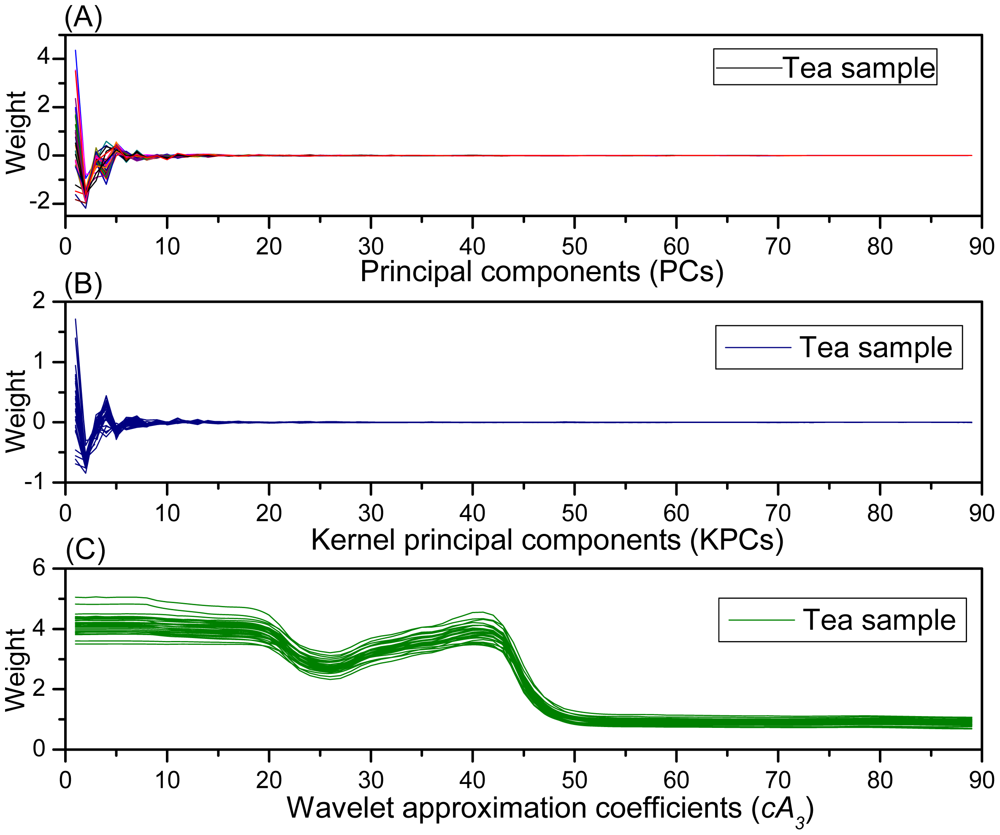 Through feature extraction, WT, PCA and KPCA produced 89-dimensional new synthetic variables from original 651-dimensional spectral data respectively. Thus, samples can be represented with these new variables. Figure 5 shows the descriptions of tea samples in these new synthetic variable spaces. It can be found that the samples are described in the similar way by PCA and KPCA. Obviously, there are sharp peaks and valleys at the beginning of these curves in Figure 5(A,B), and then the curves gradually tend to 0, it can be concluded that most of the variance is centralized in the first tens of PCs and KPCs respectively. While in Figure 5(C) the 89-wavelet coefficients description of samples is very similar to the original spectral, indicating that the WT effectively captures the trend and characteristic information of the original spectra in low dimension.