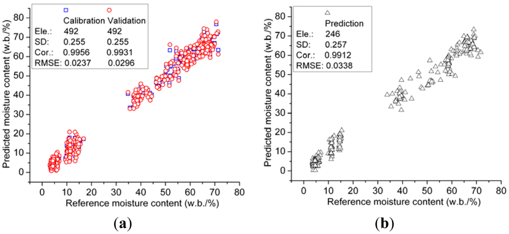 As shown above, the 89-dimensional coefficients cA3 were proved to be the optimal characteristics of spectroscopy, thus these coefficients were set as independent variables for further analysis. To obtain the optimal measurement, three regression algorithms including PLSR, MLR and LSSVM were adopted to develop regression models. Furthermore, LSSVM model was also based on RBF kernel function, and the kernel parameters of gam (γ) and sig2 (σ2) were optimized as 111,570 and 972.655 by grid-search which was a two-dimensional optimization procedure based on exhaustive search in a limited range [30]. The determination results of these three models are listed in Table 7. In detail, the MLR model obtains outstanding result with high correlation (r), and low root mean squared error (RMSE). Moreover, LSSVM model acquires excellent results in calibration stage, but the prediction results of the LSSVM model is slightly worse than that of the MLR model. And the PLSR model performs relative worse in both calibration and prediction stages comparing to MLR and LSSVM models. It may be concluded that the MLR model is the most proper description for the relationship between spectroscopy and MC. The results of the MLR model are plotted in Figure 6.