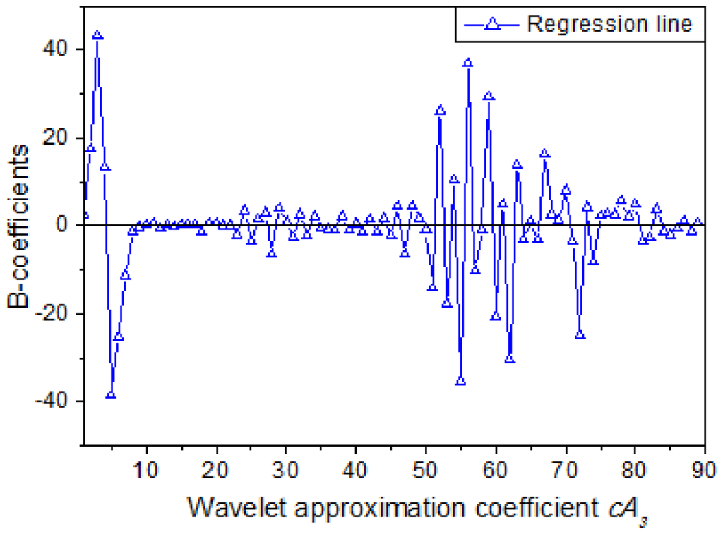 In the MLR model, the relationship between wavelet coefficients cA3 and response variable (MC) could be represented by a set of regression coefficients seen in Figure 7. It can be seen that the B-coefficients of many wavelet approximation coefficients are close to zero, and intense jagged peaks and valleys can be seen at the beginning and in the middle of the regression line. The B-coefficients represent the independent contributions of each independent variable to the prediction of the dependent variable. However, the amplitude of B-coefficients is related to the amplitude of the corresponding independent variables. So it is improper to detect fingerprint wavelength solely based on B-coefficients. In this manuscript, characteristic wavelength is obtained through combination of B-coefficients and experience as well as repeated attempting. Afterwards six determination models were established based on six sets of independent variables respectively, and the results are listed in Table 8.