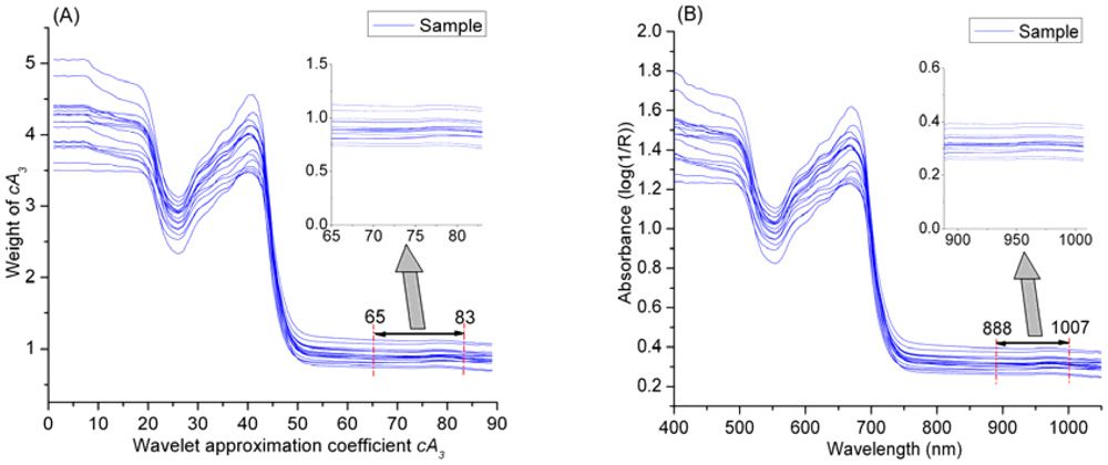 Nowadays, nonlinear algorithms including kernel principal component analysis (KPCA), artificial neural network (ANN) and least squares support vector machine (LSSVM) are frequently used for description of nonlinear phenomena [13–15]. Besides, wavelet transform (WT) shows great potential in the study of biological systems due to its merits in both space and frequency localization [16], exemplified in applications such as wind fields estimation [17], multi-spectral imaging classification [18], and soil spectral analysis [19,20]. Through decomposition of data in different scales and frequencies, the inherent structure and characteristic information may be discovered in wavelet decomposition coefficients [21,22]. Furthermore, it is easy to obtain the relationship between wavelet decomposition coefficients and original spectral data based on the clear decomposition structure of WT, which can be used to detect effective wavelengths for the composition, but few reports can be found in literature in relation to how to detect the effective wavelength for WT analysis.