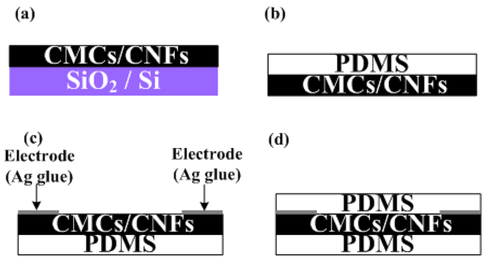 The fabrication process of the flexible pressure sensor is shown in Figure 1. The CMCs/CNFs were grown on silicon oxide film with dimensions of 10 × 10 mm2 by chemical vapor deposition (CVD) at 700 °C using ratios of Fe:Sn catalysts ranging from 80:20 to 97:3, as shown in Figure 1(a). A thickness of silicon oxide film of 500 nm was pre-deposited on 4 in silicon wafer (100) by a low-pressure chemical vapor deposition method. The powder catalyst for the CMCs grown herein was prepared by mixing Fe acetate and Sn acetate in Fe:Sn ratios = 80:20 to 97:3 in ethanol, wherein the molarity of Fe-Sn was 0.6 M. The substrate, a coating of Fe:Sn catalyst, was inserted into a quartz tube furnace at 450 °C in air for 30 min. Finally, the as-annealed sample was heated in a 1-inch quartz tube furnace at 700 °C under a 600 sccm flow of Ar gas. At 700 °C, C2H2 gas was supplied as the carbon source at a flow rate of 5 sccm for 15 min in order to grow CMCs. The PDMS was dropped on as-grown CMCs/CNFs in a cast to control the thickness of the PDMS layer. Simultaneously, the samples were placed in a low pressure chamber to eliminate the micro-bubbles inside the PDMS. After the PDMS was dried, both the PDMS and CMCs/CNFs were peeled off, as shown in Figure 1(b). Ag glue was coated on both edges of the samples as electrode (Figure 1(c)). When the Ag glue was dry, the top layer of PDMS was coated on CMCs/CNFs to complete the sensor, as shown in Figure 1(d). The dimensions of the pressure sensor in this work were 10 × 10 × 1 mm. A scanning electron microscope (SEM JEOL-6390) was used to examine the results of CMCs/CNFs. In addition, to evaluate the pressure sensing of the CMCs/CNFs pressure sensor, a load cell and multimeter were used to collect sensitivity measurements.