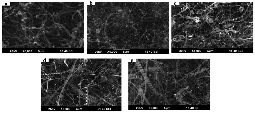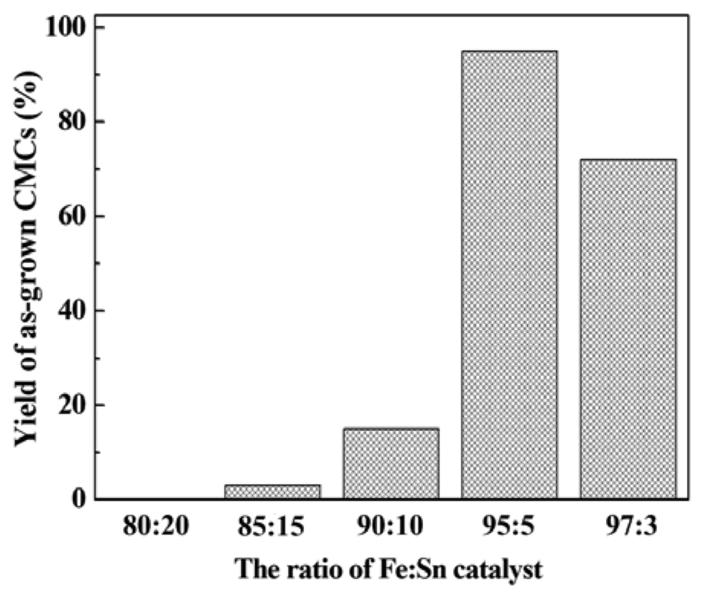 Figure 2 presents SEM images of the morphology of the as-grown CMCs/CNFs at various Fe-Sn catalytic solutions. The mass ratio of Fe-Sn was controlled from 80:20 to 97:3 to determine the optimum proportion for the growth of CMCs. No CMCs were grown from the powder catalyst with a Fe-Sn ratio of 80:20. However, when the Fe-Sn ratio was controlled in the range of 95:5 to 97:3, CMCs were the main products. These results suggest that the optimal mass ratio of Fe-Sn was 95:5.