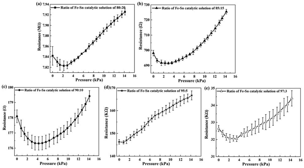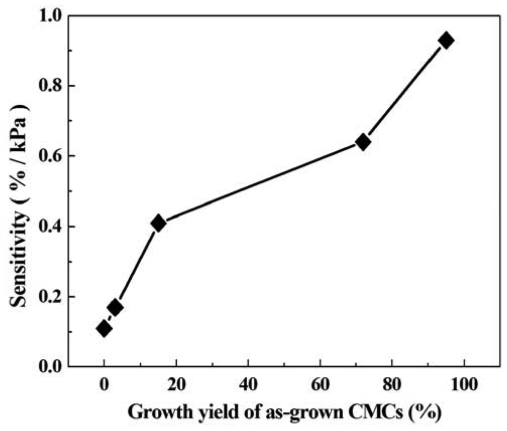 The sensitivity of the CMC pressure sensor was defined thus: sensitivity of pressure sensor = ((ΔR/Rl) × 100%)/ΔP, where ΔR = Rh − Rl, Rh is the highest measured resistance, Rl is the lowest measured resistance, ΔP = Ph − Pl, Ph is the applied pressure of the highest measured resistance, and Pl is the applied pressure of the lowest measured resistance. Figure 6 shows the sensitivity of the CMC pressure sensor with different ratios of Fe-Sn catalyst. This result indicates that the Fe-Sn catalyst of 95:5 had a maximum sensitivity of 0.93%/kPa. The sensitivity of the CMC pressure sensor increased with increases in the yield of CMCs. As compared to other pressure sensors composed of micro-materials, the CMC pressure sensor in this work has the greatest sensitivity (Table 1). The sensitivity in this work is almost 10.3 times that reported in [4] (metallic single-walled carbon nanotube), 25.6 times that in [5] (multi-walled carbon nanotubes), and 15.1 times that in [6] (carbon fiber). The 3D structure of CMCs allowed a large amount of contact area, resulting in the greatest variation in contact resistance.