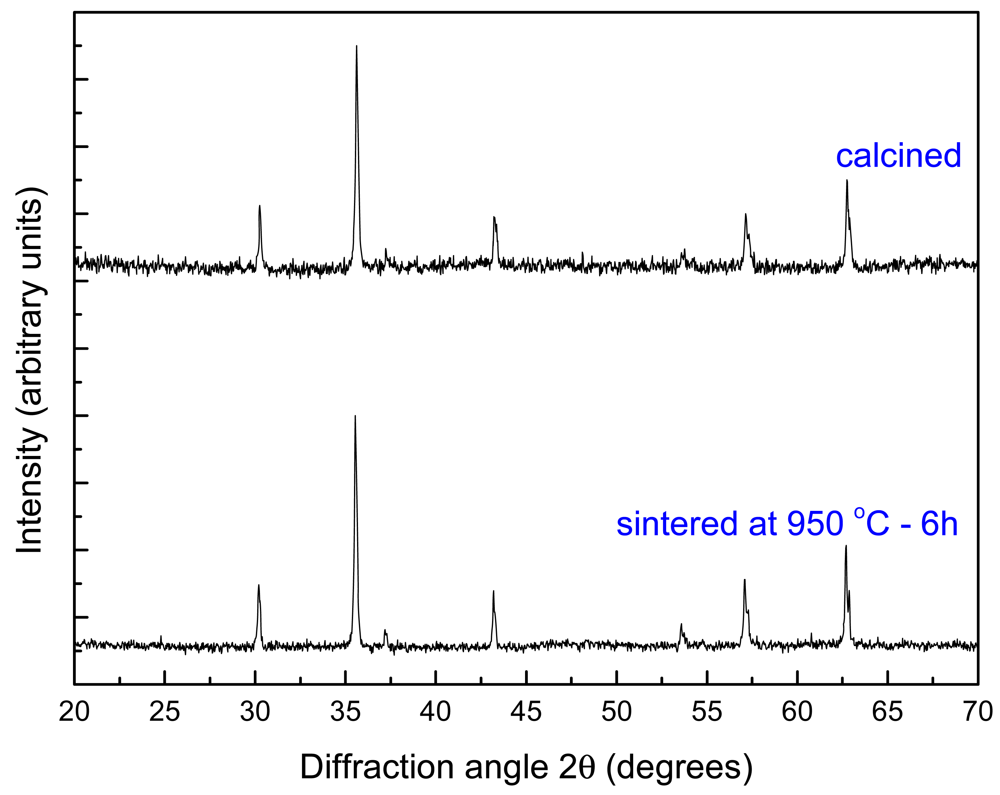 The results from X-ray analysis of the ferrite powders are shown in Figure 1 and they indicate that both calcined and sintered powders were constituted of the expected spinel phase. The sintered powder had a lattice parameter of 8.37 Å, which is in agreement with experimental data from literature [12]. The calculated “dref” was 5.32 g/cm3.