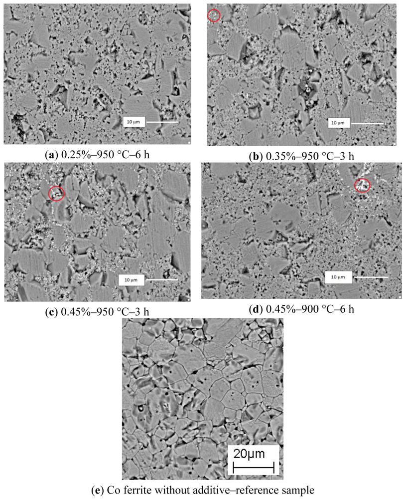 The observation of the Bi-containing particles in Figure 2 indicates a non-uniform distribution in the microstructure and sometimes it emerges concentrated in some regions, coming out in large sizes. Mürbe and Töpfer [11] studied the microstructure of liquid-phase sintered Ni-Cu-Zn ferrites with Bi2O3 additions. The authors used high-resolution Transmission Electron Microscopy (TEM) to observe a sample with 0.375 wt% Bi2O3 addition and sintered at 900 °C for 2 h. They observed the presence of Bi-rich phases forming very thin films between the ferrite grains. It is also possible that Bi3+ ions of the additive substitutes Fe3+ ions of the ferrite [21], locally altering its stoichiometry to CoFe2-xBixO4. Therefore, based on these results, although Bi-containing particles were rarely detected in the micrographs of the sample with 0.25% Bi2O3, it is expected that higher resolution techniques as Field Emission Gun (FEG) or Transmission Electron Microscopy (TEM) could probably be able to resolve more particles in a nanoscale.