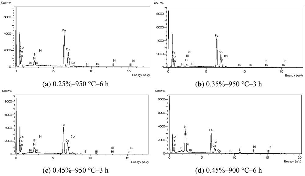 The microstructures of the samples that attained D > 90% are shown on Figure 2, together with that of the reference sample. The liquid-phase sintered ferrites presented a non-uniform grain size and the presence of white second-phase particles was observed. The results from EDX analysis, which was carried out in one white particle per sample, are shown on Figure 3. They indicate that these particles contain Fe, Co, and Bi, that probably crystallized from the additive liquid state. The Bi fraction of the particle analyzed in the sample sintered at 900 °C was undoubtedly higher than the fractions found in the samples sintered at 950 °C. In this sample sintered at lower temperature, it is possible that some Bi2O3, which is a diamagnetic substance [18], remained after sintering.