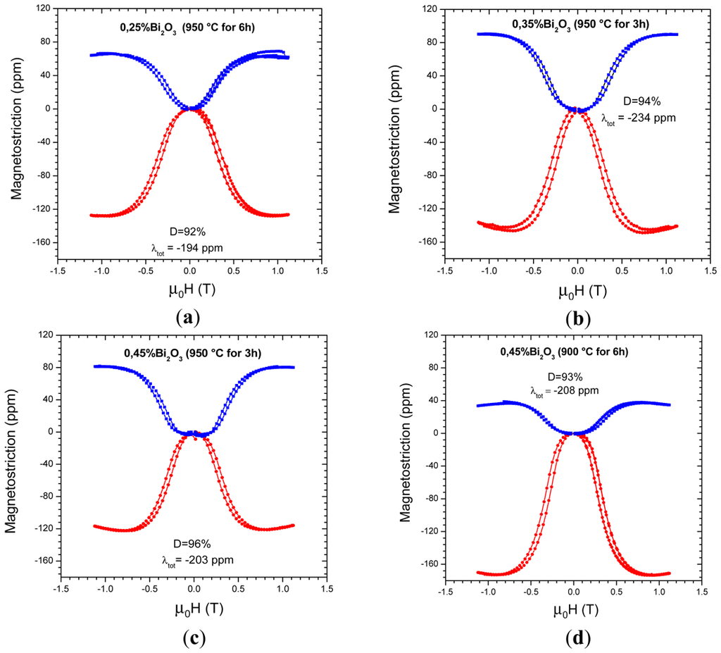 It is expected that the magnetostriction of polycrystalline samples that have isotropic microstructure with equiaxed and randomly oriented grains follow the proportion λ// = −2λ⊥. This proportionality was not observed in all samples as a consequence of the processing method, which resulted in samples with anisotropic microstructure. The anisotropy of microstructure is more evident in the sample with 0.45% Bi2O3 sintered at 900 °C for 6 h, where λ// ≈ −4.8 λ⊥.