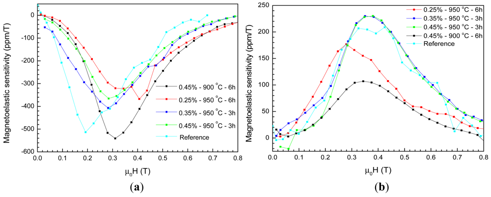As expected, the more relevant results were obtained for the direction parallel to the magnetic field, because the saturated magnetostriction values are higher in this configuration. The highest sensitivities were reached by the samples with 0.45% of Bi2O3, sintered at 900 °C for 6 h and with 0.35% of Bi2O3, sintered at 950 °C for 6 h, having the first a maximum sensitivity very close to the reference sample. Among the liquid-phase sintered samples, the one with 0.35% Bi2O3 addition presented the highest longitudinal magnetoelastic sensitivity in lower fields. Another virtue of both samples is that the maximum sensitivity occurs at low fields, lower than 0.2 T. As expected, the maximum magnetoelastic sensitivity is directly related to the maximum magnetostriction attained in the samples in the parallel configuration and therefore, must be associated with the second phases produced due to the liquid-phase sintering with Bi2O3.