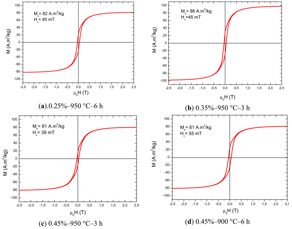 Figure 6 shows the hysteresis curves of the samples. The values of 81–82 A.m2/kg for the saturation magnetization (Ms) are close to the reference sample (around 78 A.m2/kg) and are in good agreement with other works in literature [13,22]. The sample with 0.35% Bi2O3 presented the highest values of Ms and the sample with 0.45% Bi2O3, sintered at 900 °C, presented the highest coercive field (Hc). The values of Hc are influenced by the fractions of second phases and porosity, as well as the grain size; the lower sintering temperature of 900 °C probably resulted in a smaller grain size, which contributed to increasing the coercivity.