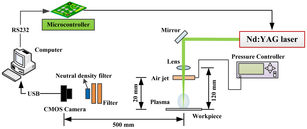 The experiment setup, including the laser machining system, image acquisition unit, and computer control and analysis system, is shown in Figure 1. The computer is connected to a microcontroller, which controls the laser machining parameters, including the machining frequency and time, to trigger and control the laser machining system (LOTIS, LS-2134UTF, Nd:YAG laser system). The laser beam strikes the two kind of workpiece (aluminum, 5052, 0.6-mm thick, and stainless steel, 420, 0.8-mm thick) surface and induces the ionization phenomenon caused by plasma light. The plasma image of the ionization phenomenon passes through the wavelength filter (190–534 nm OD: 6.5, 850–1,070 nm OD: 5, 910–1,070 nm OD: 6) and neutral density filter (transmittance 13%) and is acquired by the CMOS camera mounted radially 500 mm from the work site. The microcontroller unit triggers the laser system to generate a single laser pulse and simultaneously delays a short time to control the image acquisition unit, which captures a single plasma image of the laser pulse. The plasma light is too bright for image analysis. To distinguish between the ionization phenomena for the air and material caused by the laser-induced plasma and to reduce the maximum brightness of the image acquired by the CMOS camera, a wavelength filter and neutral density filter are placed in front of the camera. The light from the laser-induced plasma that passes through the neutral density filter will remain at the wavelength of the ionizing material. The image analysis in this study focused on the ionization of the material from the laser-induced plasma. The ambient conditions and machining parameters of the experiment are listed in Table 1, where the air jet pressure is 300 Kpa.
