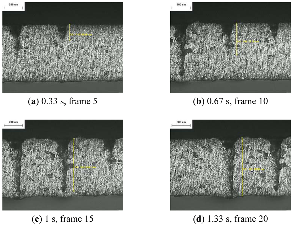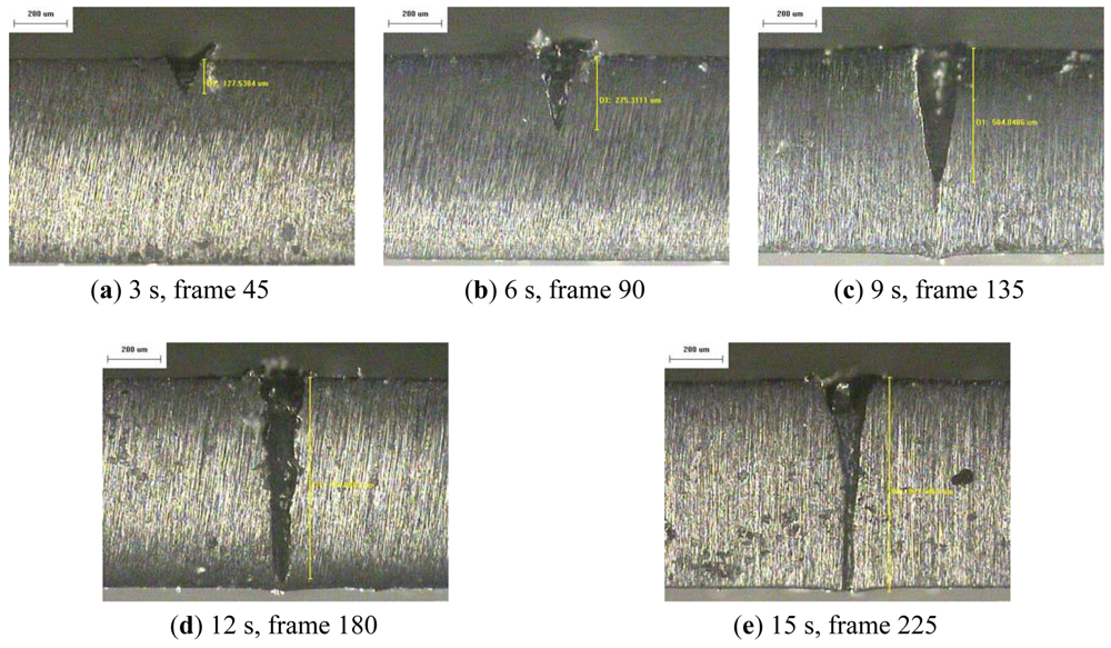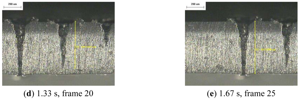 The resulting profile images for laser-drilled machining using different process times, where the radiation energy of the pulse laser was 145 mJ, 175 mJ, and 200 mJ for aluminum and stainless steel are shown in Figures 5, 6, 7, 8, 9 and 10, respectively. It is obvious that the depth of the laser-drilled holes increases with the process time. The relation between the machining hole depth and pixel value of the laser-induced plasma region is shown in Figure 11. In all cases, the depth of the laser-drilled holes could be described by a monotonically increasing function, and for both materials the ablation depth rate increases with large laser energy. Since the heat transfer mechanism near the ablation zone was heavily affected by the thermal response of the materials to the incident laser pulses. The vaporization thermal properties is known to be affected by the material boiling temperature, which is lower in aluminum (Tvap = 2,740 K) than stainless steel (Tvap = 3,134 K), thus leading to an earlier ablation under the same incident laser pulses. There, a faster depth removal rate on the aluminum material than in steel material was observed at the ablation process as expected.