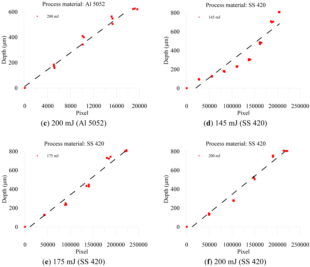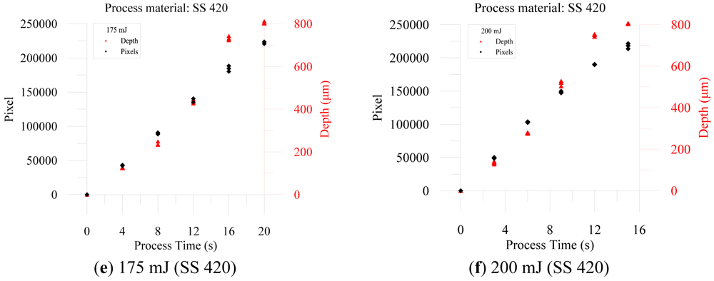 The results reveal that the cumulative plasma size has high coefficient of determination (R2) of 0.984 (aluminum, 145 mJ), 0.95 (aluminum, 175 mJ), 0.983 (aluminum, 200 mJ), 0.892 (stainless steel, 145 mJ), 0.975 (stainless steel, 175 mJ), and 0.978 (stainless steel, 200 mJ) with the machining depth, respectively. The hole depth is directly proportional to the machining pulses and the sum of the pixels of all the frames of the plasma region. Based on the proportional relation, we could use the total cumulative pixel values to estimate and detect the laser-drilled hole depth. Also, higher laser energy could induce both a larger region and additional pixels of plasma. Considering the fact that the radiation energy of the laser machining also affects the machining depth, a higher energy could generate deeper holes for the same process time, as shown in Figure 12. We also found that when the laser beam struck the material surface, the higher energy induced a larger plasma region. In this study of image processing based on machine vision, we determined that the size of the laser-induced plasma region at the surface of the workpiece could be transformed into the value of the pixels. The laser energy conditions determined both the laser-drilled hole depth and size of the plasma region, along with the process time. Thus, we could analyze and obtain the total pixels of the plasma region in on-line during processing, and we achieved a on-line detection and estimation of the depth of a laser-drilled hole. However, as shown in the Figure 12, the variations in the cumulative plasma size and the drilling depth with the time were observed.