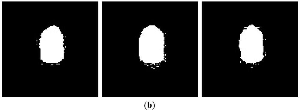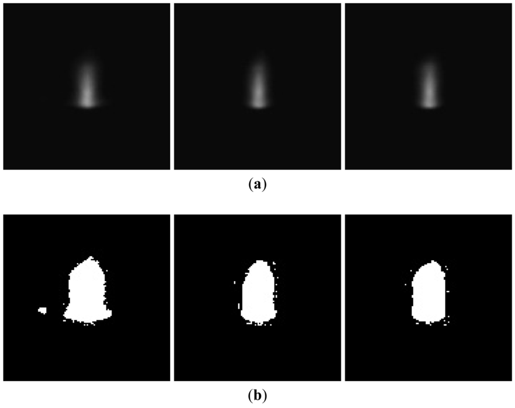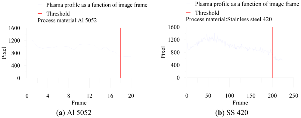 The laser-drilled machining, including breakthrough detection and blind hole depth analysis, were recorded and analyzed using 8-bit encoding and 120 × 120 pixel images. Through binarization during the image processing, we could determine the plasma emission region and calculate the total pixels of the plasma region. The images of aluminum and stainless steel after binarization are shown in Figure 2 and Figure 3, respectively. In breakthrough detection, the total pixels in the plasma region of a single image frame were recorded and analyzed. Breakthrough detection for laser drilling was successfully developed in a previous study [16]. Breakthrough detection can be briefly explained as follows. When a breakthrough occurs, the amount of plasma declines abruptly. The pixels in the plasma region of a single image frame would also decline abruptly and simultaneously at this time, as shown in Figure 4. Depth control and analysis for laser-drilled machining, the number of laser pulses is used to control the depth of a laser-drilled hole in the conventional control method. As the number of laser pulses increases, the depth of the hole would also increase. The conventional control method uses experience-based control rules to detect the completion of the ablation process off-line.