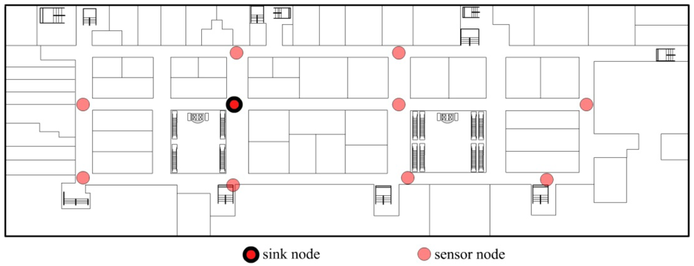 According to above assumptions, we have designed an application example, which is shown in Figure 1, which shows the plan of a department. The system is used to monitor the temperature of the department. Sensor nodes are deployed in the department and they are not moving any more. There is only one sink node in the application, which is used to collect sensor data and to transmit data to a PC.