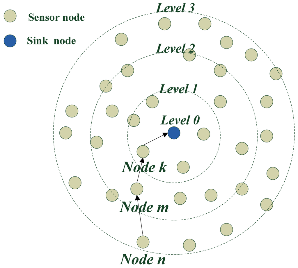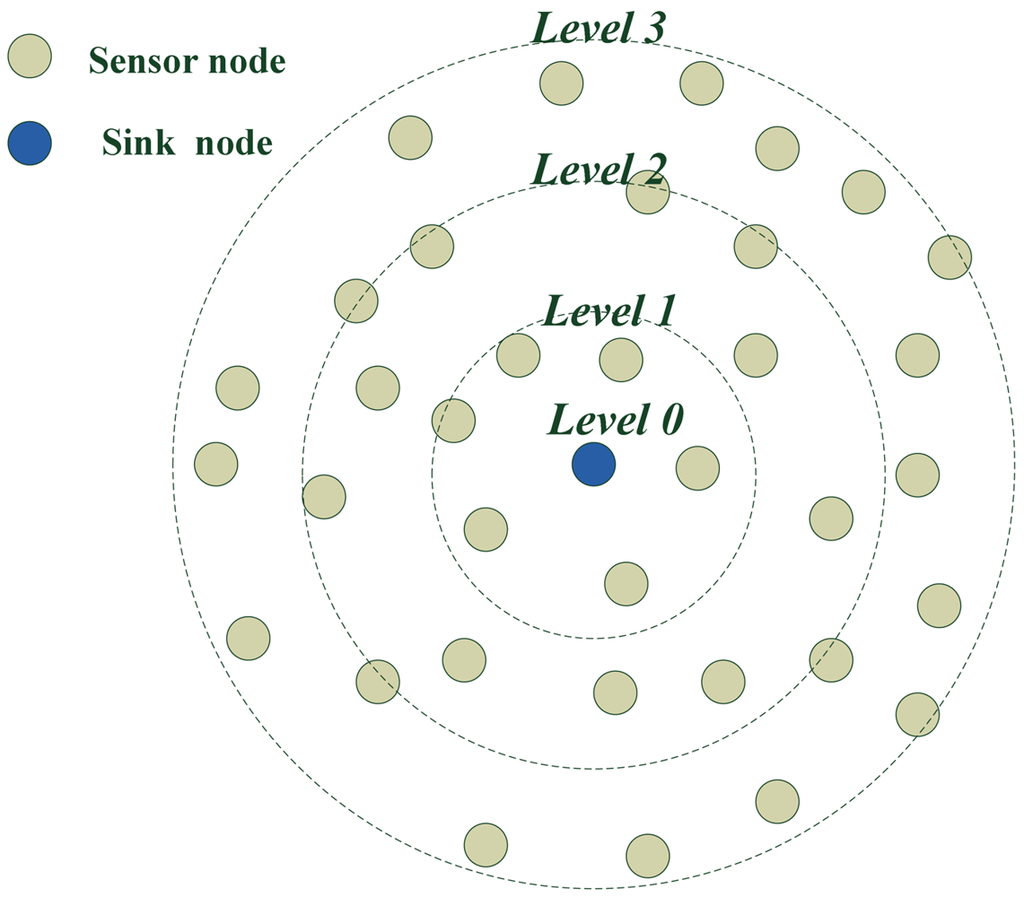 Figure 8 shows the ring situation of level building process when the sink node is in center. It gives an example of a level building process. The level of the sink node is zero. The level of nodes in one hop to the sink node is level one and the level of nodes at two hops from the sink node is two. The level of nodes at three hops to the sink node is three, etc.