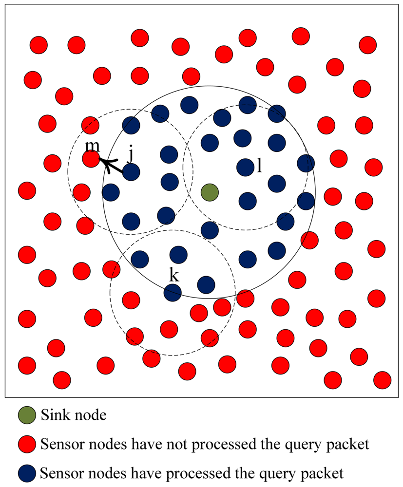 Sensor nodes may receive query packet duplicates from its neighbors that are closer to the source node before processing the packet. Nodes can determine whether to rebroadcast the packet according to the percentage of neighbors that have processed the packet. We define a threshold P, which stands for the percentage of neighbors that have processed the receiving packet, to limit the rebroadcast times.