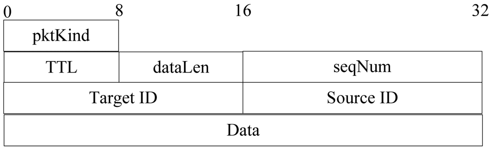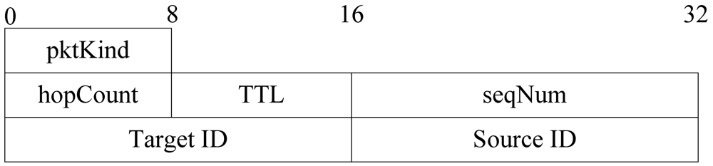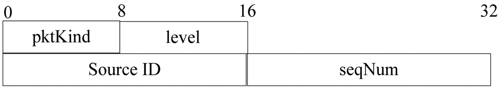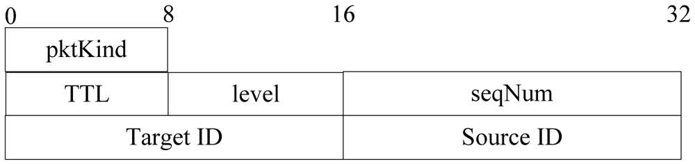 Level building process is only executed once and it is part of initial setup of the network. Since we assume a static network, there are no sensor nodes added to network and all nodes are static after deployment. When a node's energy is used up, it broadcasts a message to its neighbors to notice that it has died, and then its neighbors remove its information from the cache. The lifetime of LevelBuilding packet is not determined by its TTL. In the diffusion process, all sensor nodes rebroadcast query packet automatically. When all nodes' level value gets to the minimum value, this process finishes. The format of a level building packet is shown in Figure 7.