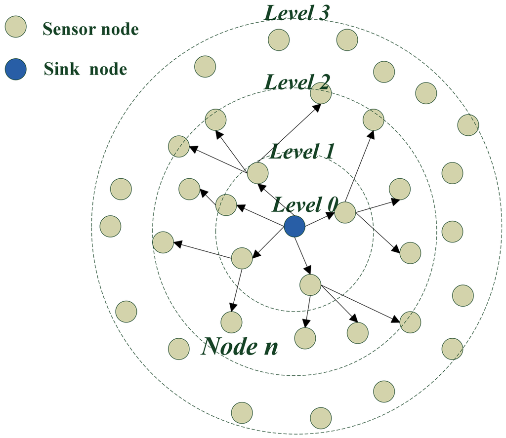 After deployment of the network, the sink node broadcasts a LevelBuilding packet by adding its level information to the packet. The level of the sink node is considered to be zero, so the initial level of LevelBuilding packet is zero. The level of sensor nodes is initialized to be a large integer, which is larger than the maximum level of the network. When a sensor node receives this packet, if level value in LevelBuilding packet is smaller than the node's level, the node updates its level as the level value in LevelBuilding packet plus one. Then the sensor node rebroadcasts the LevelBuilding packet by updating the packet's level with its level information. Sensor nodes send their level information to the sink node. How the information packet goes back to the sink node is introduced in Section 4.5. If the level value in LevelBuilding packet is larger than the node's level value or equal to the node's level value, the node drops the packet directly. A sensor node could receive more than one LevelBuilding packets, but it sets its level value to the minimum level of received LevelBuilding packets, so we can know that level value of each node stands for minimum hops between the node and the sink node.