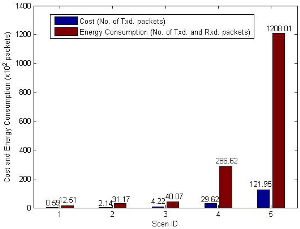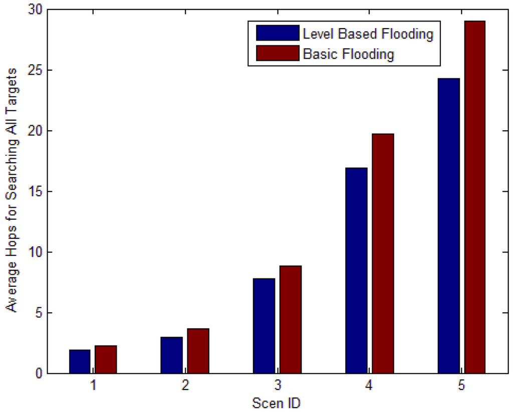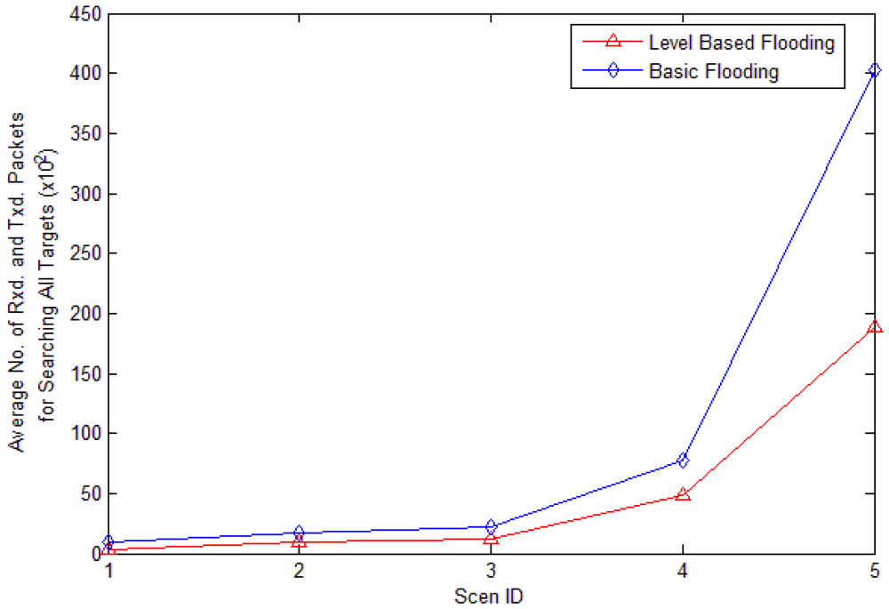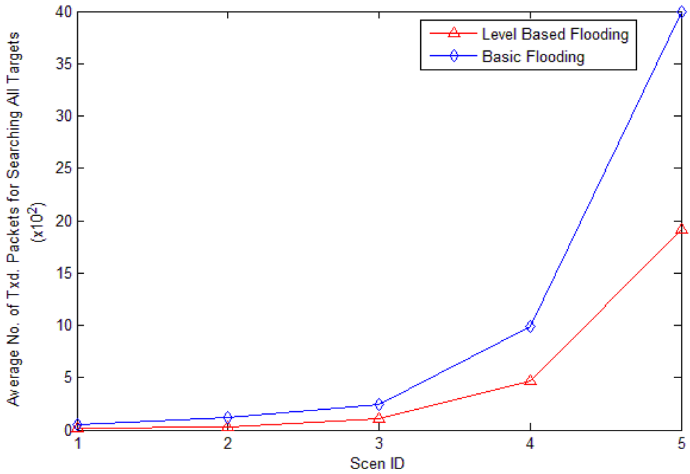 Average energy consumed: the average energy consumed for finding a target node. This includes the average number of packets transmitted and received for finding target nodes. When the sink node searches for target node Ti, the number of packet transmitted and received by all nodes is ECi. average_energy_cost can be computed by Formula (2), where N is the set of target nodes, and |N| is the number of all target nodes: