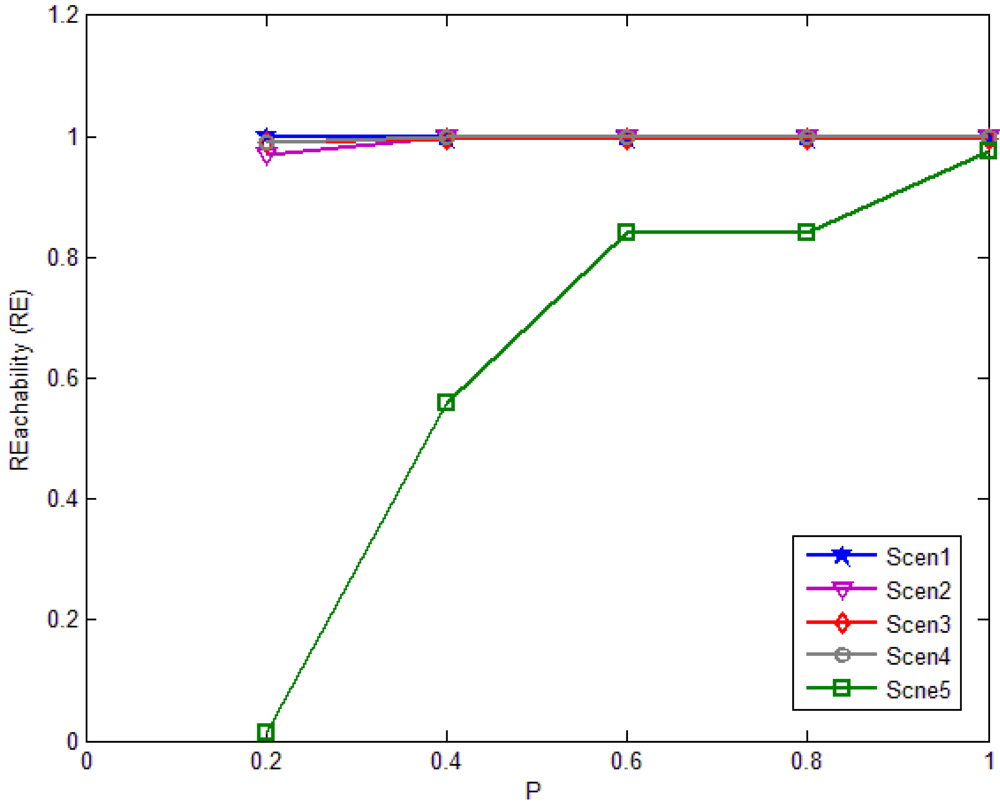 REach ability (RE): the number of nodes receiving broadcast message divided by the total number of nodes that are reachable, directly or indirectly, from the source node. The total number of sensor nodes in network is m, and the number of nodes receiving broadcast message is n, so RE can be computed by n/m.