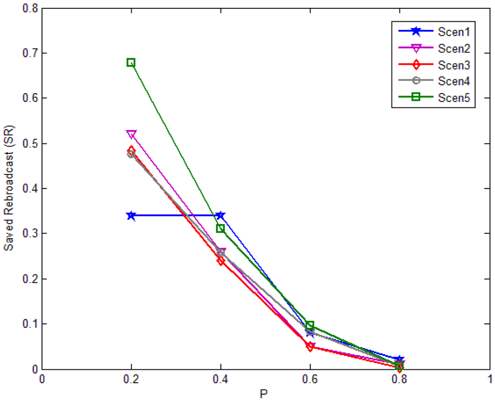 The saved rebroadcast in different scenarios with different P is shown in Figure 19. The amount of rebroadcast saving decreases proportionally to P, as P id increasing. When P < 0.5, the effect is obvious, and the scheme can save about 50%, but when P > 0.5, the scheme has nearly no effect. Various levels of saved rebroadcasts can be obtained over the scheme, depending on the average degree of nodes in the area. For instance, a scheme in lower degree (in Scenario 3) can offer about 50% savings at P = 0.2; while in a higher degree (in Scenario 1) it only offers about 30%.