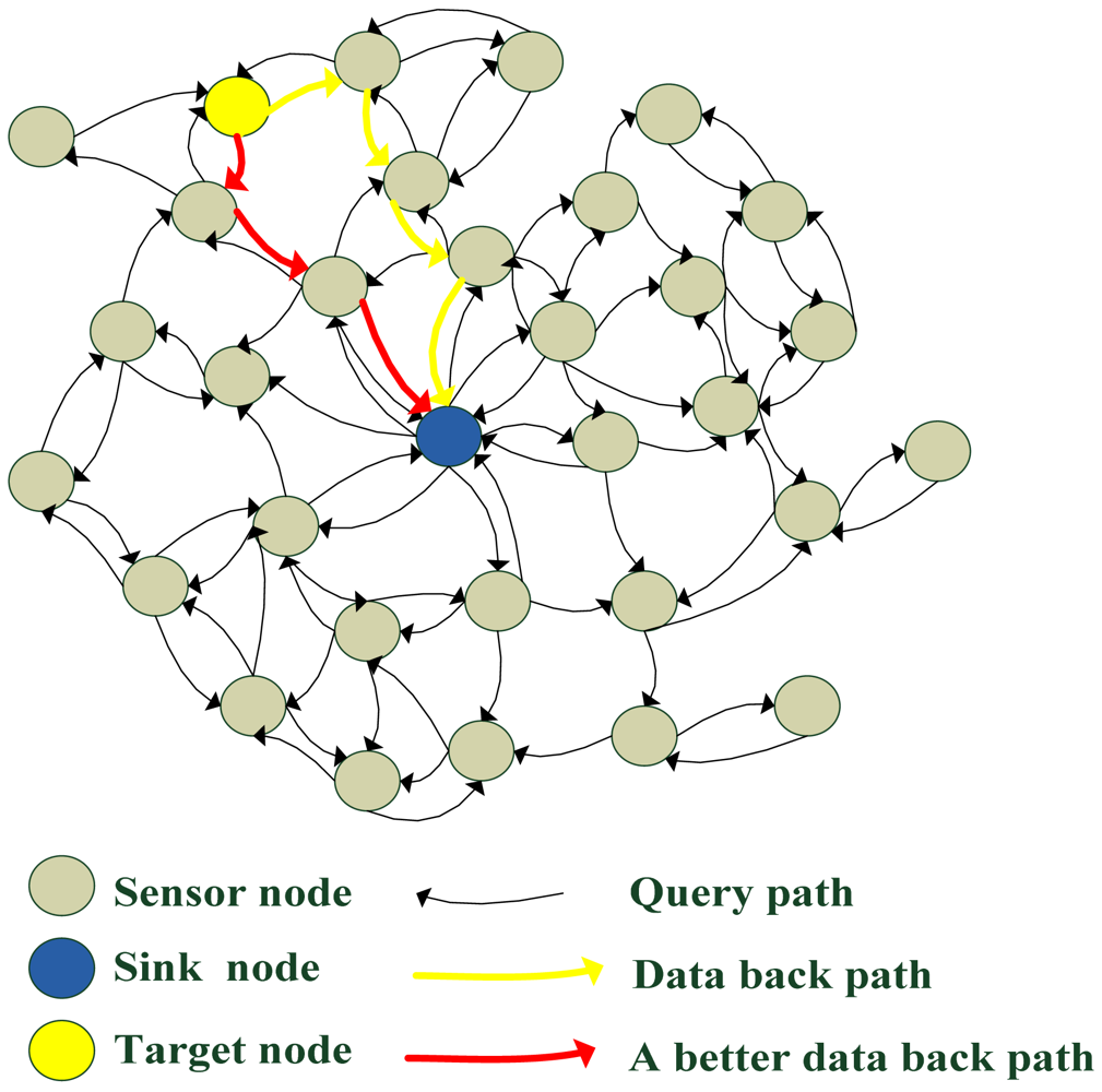 In the basic flooding strategy, if the target node wants to send data back, the query packet should record path information in the packet. As the query packet becomes larger and larger, it costs more and more energy to transmit the packet. The path information in the query packet is not the best path between the target node and the sink node. In Figure 2, the data packet may go back to the sink node via the yellow path, but the red path is a better solution.