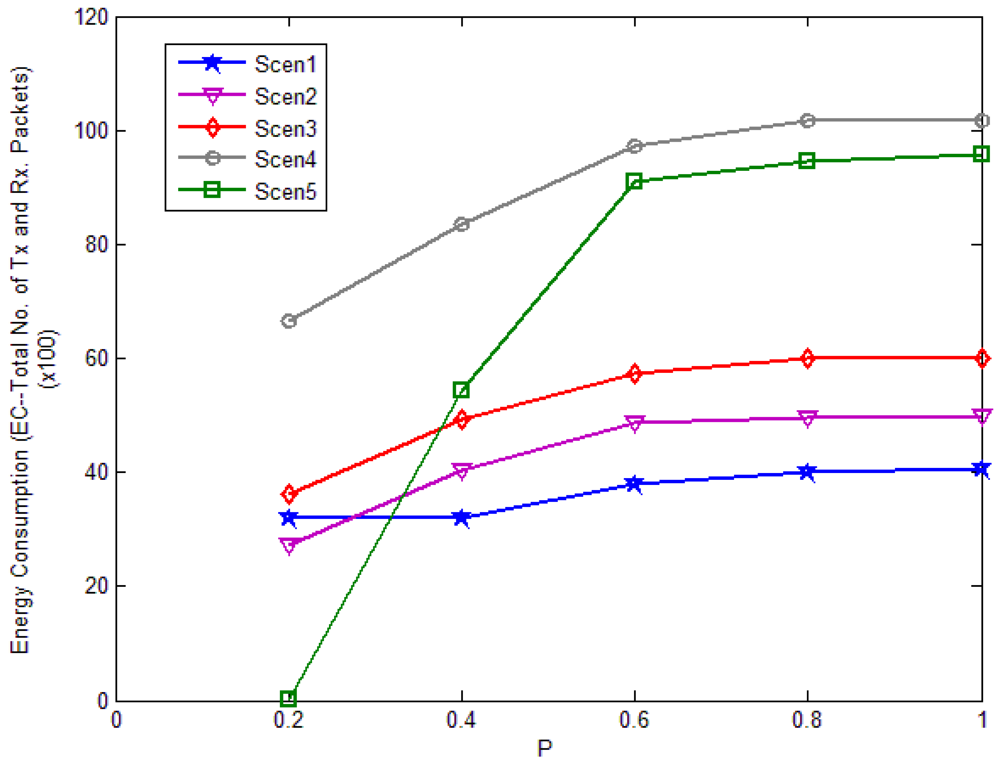 Figure 20 shows the energy consumption in different scenarios with different P values. In every scenario, the energy consumption increases with the increasing P. When P < 0.5, the energy consumption increases obviously, especially in Scenario 5. When P > 0.5, the energy consumption is nearly the same as in the basic flooding case. The energy consumption in Scenario 5 is the best, but from Figure 18 we can see its reach ability is too small when P = 0.2, which affects the successful query rate a lot. From the above analysis, in the network with high average degree, threshold P can be set to 0.2 or 0.4, at which the network can get good reach ability and energy consumption. But in the network with low average degree, threshold P should be set larger than 0.5 to get high reach ability. Although the scheme with small P can offer good energy consumption, we can't ignore the scheme's reach ability. In the compare simulations, we set P to 0.4 in Scenario 1 and Scenario 2; we set P to 0.5 in Scenario 3 and we set P to 0.8 in Scenario 4 and Scenario 5.