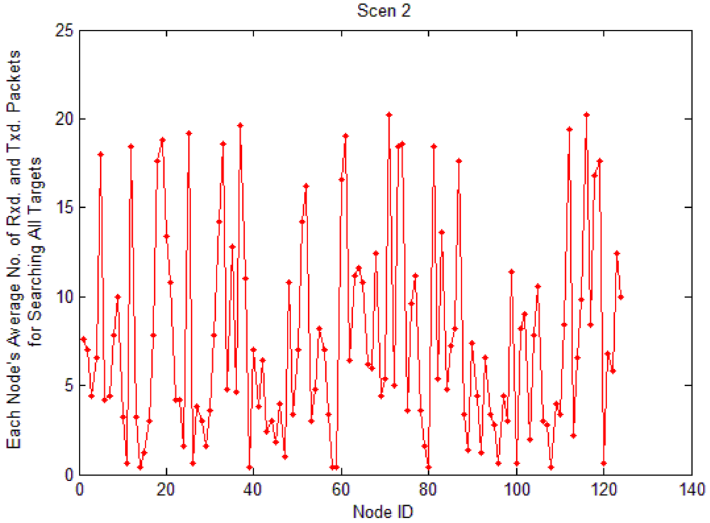 Each node's average load for searching all targets: each node's average number of packets transmitted and received for finding all target nodes. When the sink node searches for target node Ti, the number of packets transmitted and received by Node q is Loadi,q. So average_loadq can be computed by Formula (5), where N is the set of target nodes, and |N| is the number of all target nodes: