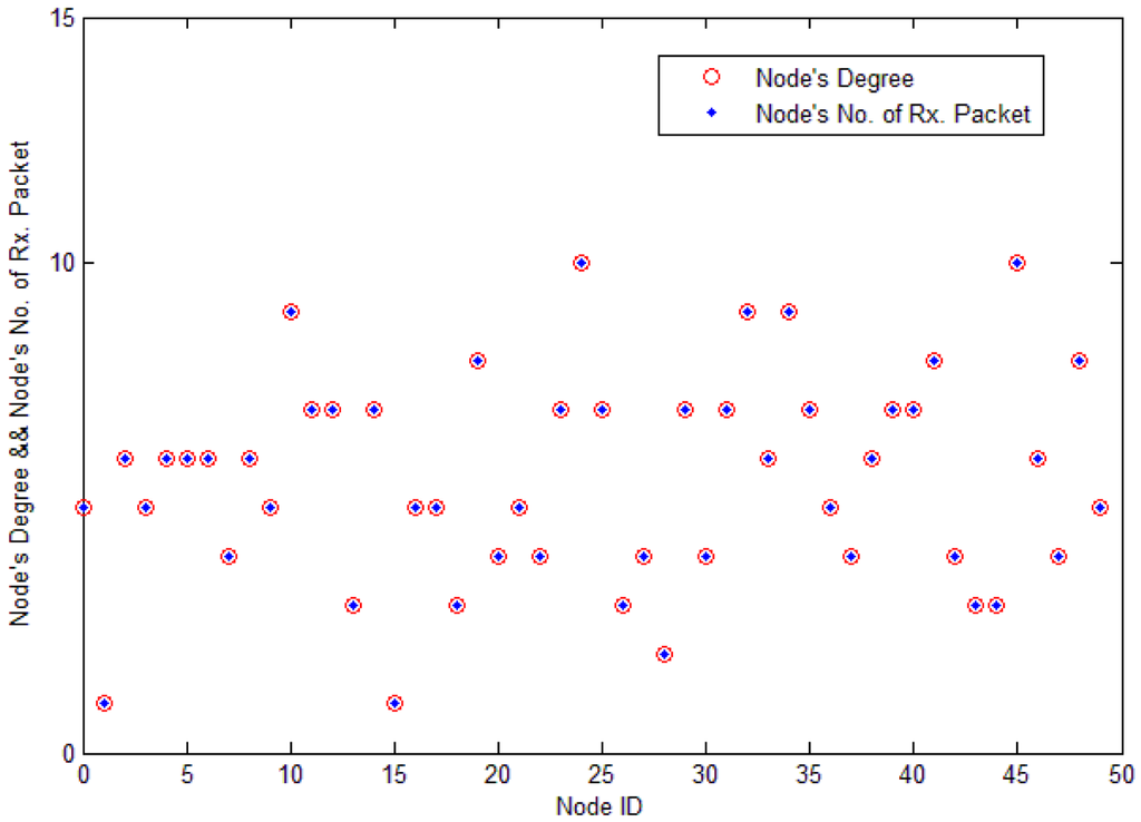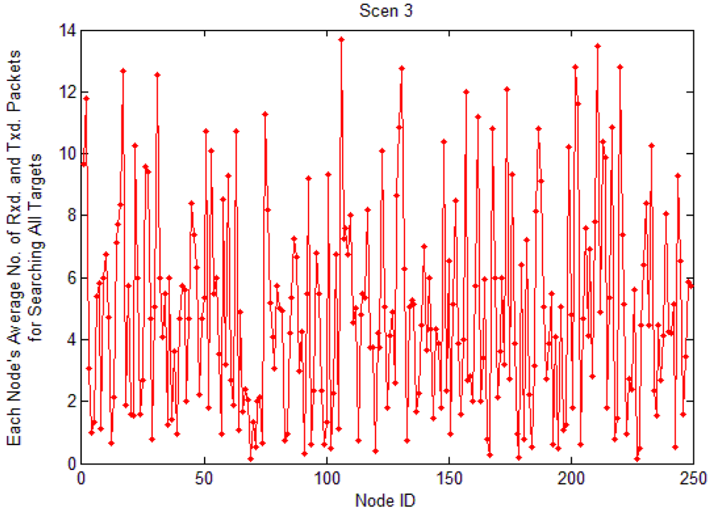 Load distribution in a network is usually very uneven due to factors such as network topology and network applications. In Figure 5, the x-axis stands for each node's ID, and the y-axis stands for each node's degree, which is the number of node's neighbors. If the value is 5, it means that the node has five neighbors and it receives five packets in each search process. From the figure, we see that each node's number of receiving packet is nearly equal to each node's degree. The speed of energy consumption is proportional to the nodes' degrees. As sensor nodes are randomly located in the monitoring area, each node's degree is quite different. Sensor nodes with large degree should reduce their rebroadcasts.