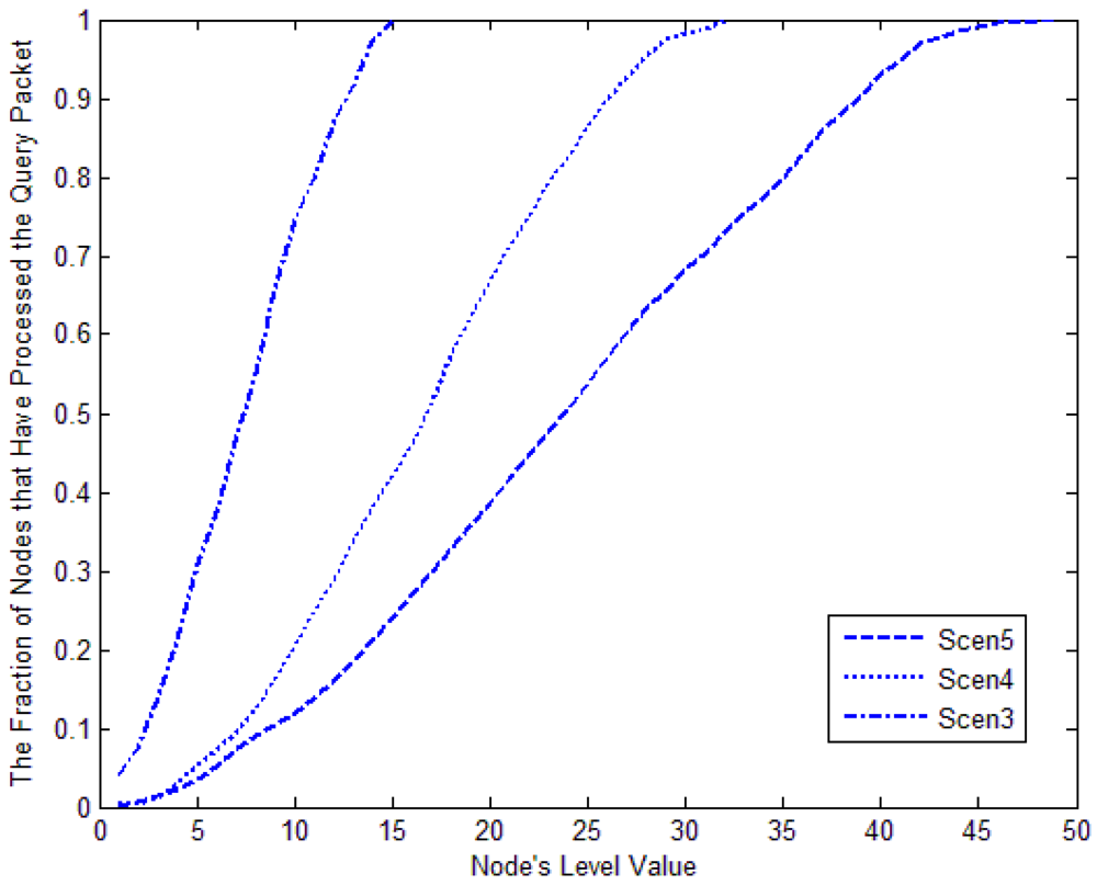 Figure 23 shows the relationship between the fraction of nodes that have processed a packet and the target node's level. From the figure we can see that the fraction of nodes that have processed a query packet increases with the target node's level. If the target node's level is higher, it should consume much more energy to search it. When the search packet's TTL is larger than nodes' maximum level, all nodes should process the packet. The situation is true in all three scenarios. The smaller the network is, the faster the curve goes up.