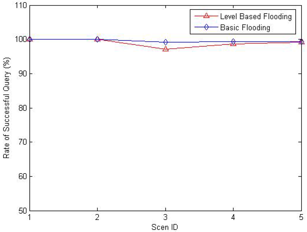 Figure 27 shows the ratio of successful query of the two strategies. The figure shows that the ratios of two strategies are all nearly 100%. As the nodes are all deployed randomly in monitored areas, there may be dead nodes exiting. As a consequence, the successful query ratio is not 100%. There is more control on the diffusion of query packets in our strategy, so the ratio is a little lower than that of basic flooding strategy.