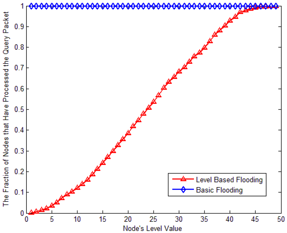 If the sink node senses emergency sensor nodes, for example the sink node receives emergency data (a temperature is too high) from a node, the sink node should find the node quickly, or the sink node wants to find a node having special data. The sink node broadcasts a query packet to the whole network. The sink node sets TTL of the packet according to the target node's level information in its cache. Only sensor nodes in the zero level of TTL level need to process the query packet. Only when the node is far away from sink node, the query packet would be broadcast through the whole network to find it. If the node is very close to sink node, the searching cost and energy consumption will be reduced a lot. The average situation is much better than basic flooding. The node receiving a query packet decides how to process the packet according to the percentage of neighbors that have processed the packet to reduce rebroadcasts.