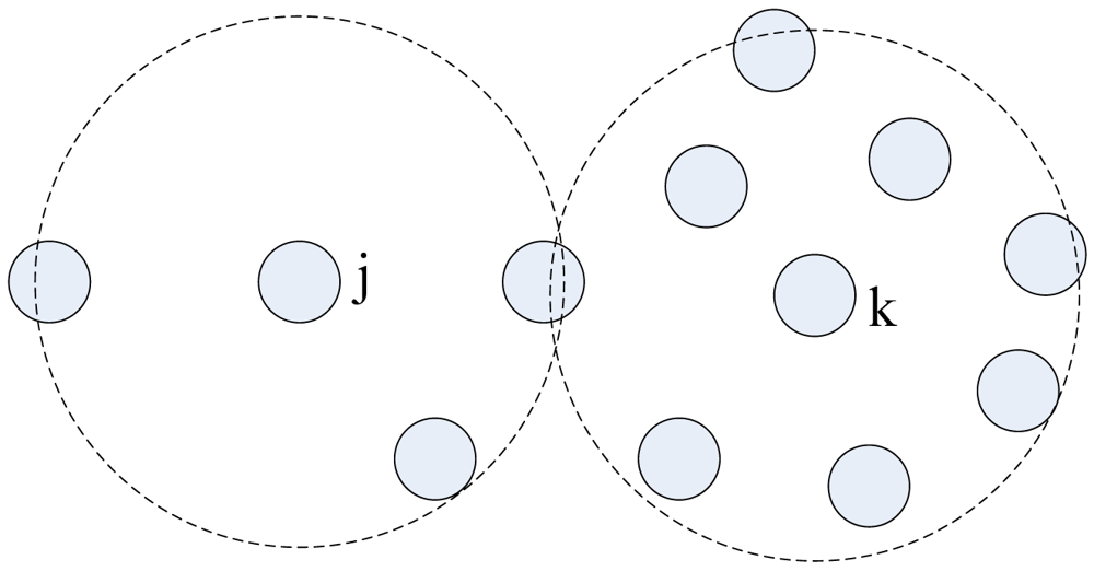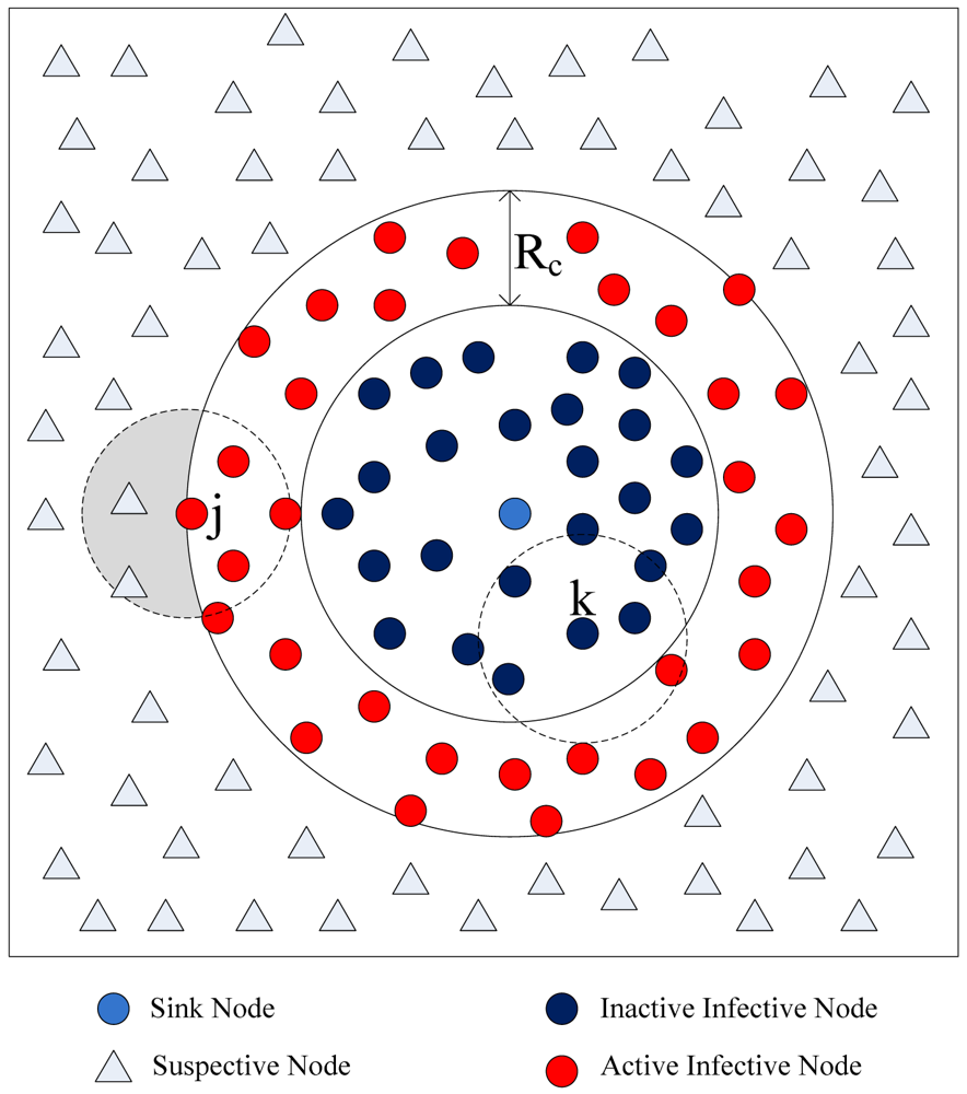 We approximate this observation by having nodes on the periphery of the infected circular region trying to infect their susceptible neighboring nodes lying outside the circle region. Only the infected nodes that lie within distance Rc from the periphery of the circle of infected nodes (nodes with red color) can communicate with the susceptible nodes, and thus can push query packets forward. As shown in Figure 3, Node k can't infect any susceptive nodes, because all susceptive nodes lie outside its communication area. Node j can infective the susceptive nodes that lie in its communication area. Only the nodes in the shaded region can benefit from Node j's rebroadcast, so a rebroadcast can only provide about 0∼61% effective additional area [31]. The nodes in Node j's rebroadcast ineffective area receive useless query packet, because they have processed the packet. We must reduce the redundant rebroadcast times as much as possible.