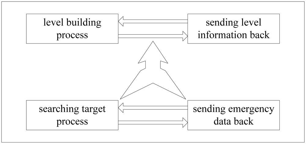 The overall architecture of LBF is shown in Figure 6. From the figure we can see that LBF consists of four components: Level Building Process (LBP), sending Level Information Back (LIB), Searching Target Process (STP), Sending emergency Data Back (SDB). LBP is responsible for dividing the network into layers according to the distance between sensor nodes and the sink node. Level information of sensor nodes is sent to sink node by LIB. STP is used to diffuse the query packet to the whole network. At last the emergency data is sent to sink node by SDB. LBP and LIB run when we deploy the network and they run at the same time. STP and SDB run based on the results of the first two parts. Next we introduce each part in detail.