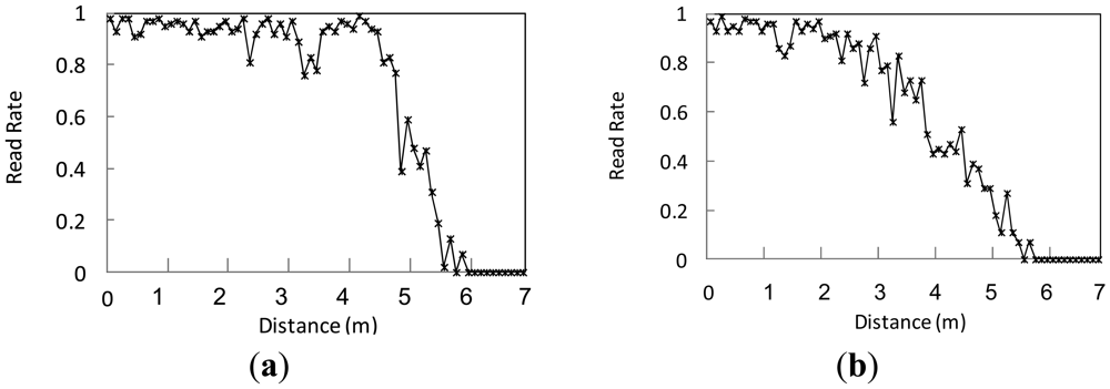 Adopting the statistical methods similar to SMURF, each epoch is viewed as an independent Bernoulli trial with success probability pi []. An epoch may be specified as a number of interrogation cycles or a unit of time. A typical epoch range is 0.2–0.25 seconds []. For each epoch, the reader keeps track of all the tags that have been identified, and additional information such as the number of interrogation responses for each tag and the last time the tag was read. Assuming, there are n interrogation cycles in an epoch, the number that tagi is monitored is mi. We can get the read rate of tagi at the moment by pi = mi/n. In the process of passing through the reader's read range, tags will be continuously scanned. Also in the whole process, the read rate of tag is not constant but constantly changing with the distance between the tag and reader. Besides, some researchers have proved by experiments that in the reader's detection region there is a linear relationship between read rate p and distance s []. For specific readers, the detection range S is a constant. To confirm this conclusion, we have carried out similar experiments and the conclusion is shown in Figure 1. The quiet condition means an ideal working environment of RFID devices with only a few interferences, while the noisy condition means a work environment with more interferences.