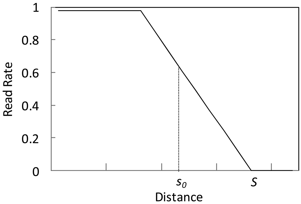 By further abstraction of the conclusions above we get the relationship between read rate p and distance s in Figure 2. Obviously, the distance s between tag and reader and the read rate p follow the relation as: