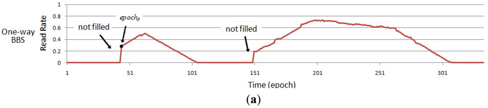 In the data stream processing, data are normally processed in order. However, if the RFID data stream corresponding to a tag is filled in chronological order by the above-mentioned method, it is easy to bring the problem of miss filling, as shown in Figure 3(a). We analyze the read rate of a tag in one time period in detail in Figure 3. Figure 3(c) indicates the read rate of the tag without miss readings and Figure 3(b) shows the raw read rate that the reader actually read. For an epochp in Figure 3(a), if the corresponding coefficient Kp > 0 and the data before the time tp has been miss read for a long period of time, the data before a period of tp will not be filled because the RFID data stream are processed in order. A simple solution is to process the RFID data stream twice, forward and backward. However, this will add a lot of computational overhead. To solve this problem, we introduce a Reverse Order Filling Mechanism. As soon as we detect the situation mentioned above occurs, the read rate of the corresponding data stream is to be refilled in the reverse direction from epochp+T. Until the original read rate pi ≠ 0 or the filling value of read rate pf = 0 the reverse filling mechanism will not be terminated. And the rest of data will be processed after that. So we only need a twice process to the corresponding data rather than all data, which ensures the completeness of RFID data cleaning, but also does not add too much computational overhead. Algorithm 1 shows a pseudo-code description of BBS cleaning algorithm.