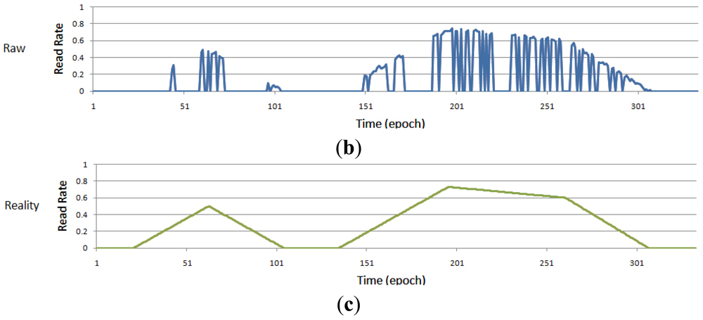 Radio Frequency Identification (RFID) is an electronic tagging technology that allows objects, places, or persons to be automatically identified at a distance without a direct line-of-sight, using an electromagnetic challenge/response exchange [,]. RFID offers a possible alternative to barcodes, and has emerged as a key technology for a wide-range of applications, including supply chain, retail stores, and asset management []. However, the widespread adoption of RFID technology is limited for the unreliability of the data streams produced by RFID readers [,]. RFID data cleaning is therefore widely considered as a principal challenge and has been an important research topic in the last few years [–].