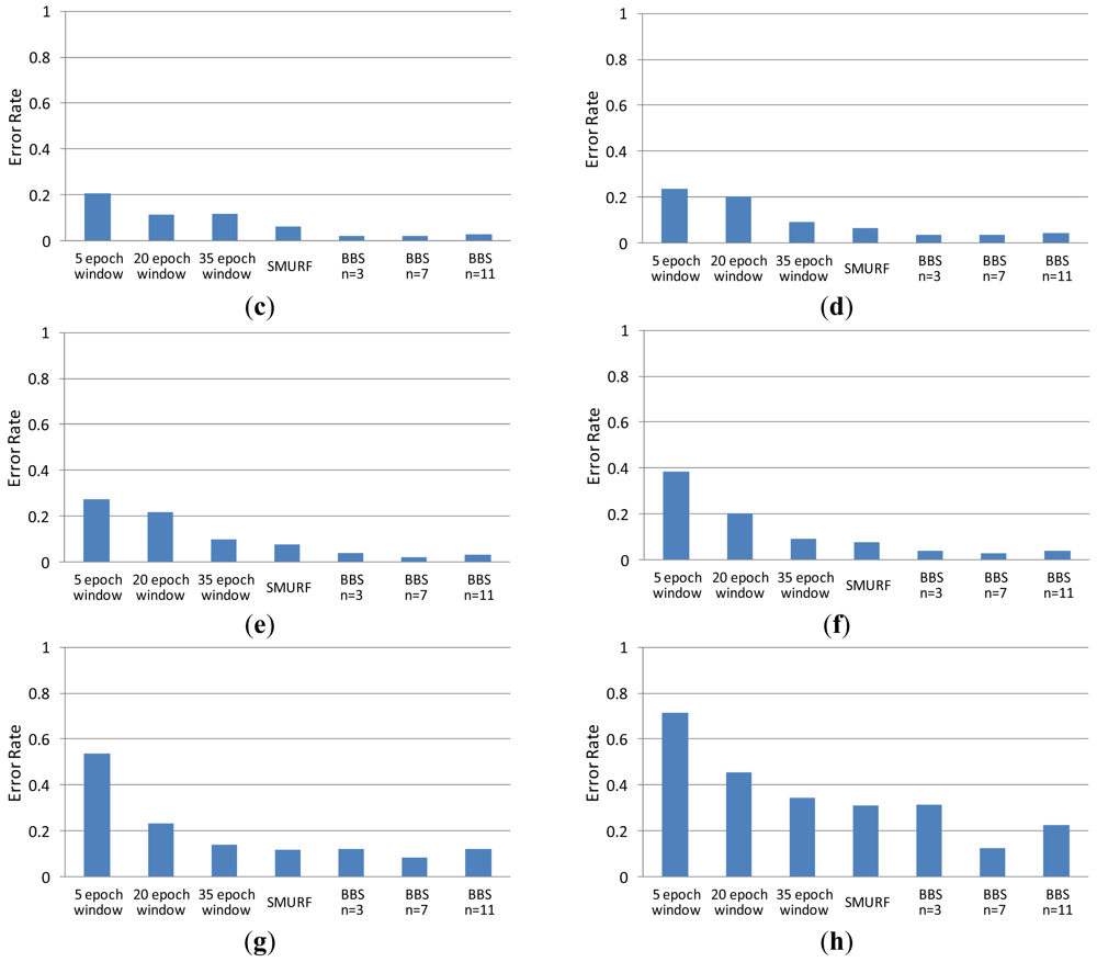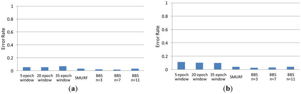 In the experiment, we compare the accuracy of data filled by BBS (with n = 3, n = 7 and n = 11, respectively), SMURF, and sliding-windows methods (with different window size: 5 epoch, 20 epoch and 35 epoch) under different missing rate (from 10% to 80%). The other experimental parameters of BBS are set as follows: m = 7, w0 = 1 and w1 = 2. We clean the same raw data with different methods. Comparing the corresponding cleaning result with real data, we can get the error rate of each method. As shown in Figure 4, the error rate of BBS is lower than that of sliding windows methods in all cases. We found that the choice of the parameter n will have some impact on the experimental results when the missing rate is greater than 70%. Therefore, in practical applications, for optimal cleaning results we should set parameters n, m, w0 and w1 with appropriate values in accordance with the actual needs. Usually, the more unstable the read rate sequence, the larger the value of n should be set; the higher the missing rate, the larger the value of m should be set.