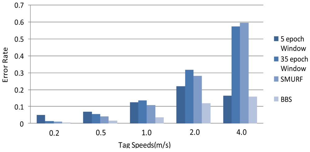 We compare the accuracy of data filled by different methods under different tag speeds. The error rates obtained are used to compare the accuracy of methods where lower error rate means higher accuracy. As shown in Figure 5, the results of BBS are obviously superior to all other methods, especially when the speeds of tags are higher than 1.0 m/s.