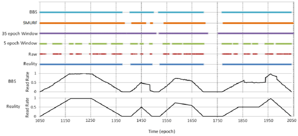 Furthermore, we analyze the case in one time period in detail (missing rate = 50%, and the length of time is 1,000 epochs). As shown in Figure 6, Reality refers to readings that would have been produced by a perfect reader without missreadings. Raw means the raw data that the reader actually read and while the others refer to the data filled with four kinds of data cleaning methods (BBS, SMURF, 5 epoch sliding-window, and 35 epoch sliding-window). The bold horizontal lines indicate the tag is present/read, and vice versa. The line at the bottom of Figure 6 is the real data of read rate without miss reading, and another line above it is the estimate of read rate by BBS (n = 7, w0 = 1 and w1 = 2). Obviously, compared with sliding window methods, BBS greatly improved the accuracy of RFID data cleaning. In particular, our BBS method not only accurately draws whether the tag is in the read range of the reader, but also can give the read rate of each epoch. So BBS make it possible to get a more exact position of the tag.