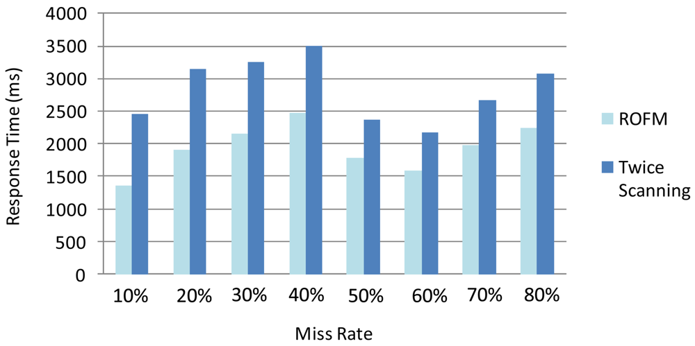 To verify the validity and necessity of Reverse Order Filling Mechanism, we design the following experiment. We focus on readings produced from a single tag with different missing rates from 10% to 80% in 10,000 epochs. We process 8 sets of data by two different methods, the Reverse Order Filling Mechanism method and the Twice Scanning Method, and determine their performance by comparing the response times. As show in Figure 7, the Reverse Order Filling Mechanism only needs a twice cleaning process to the corresponding data while the Twice Scanning Method needs the process to all data. Therefore, the former is obviously superior to the latter in the efficiency of processing data.