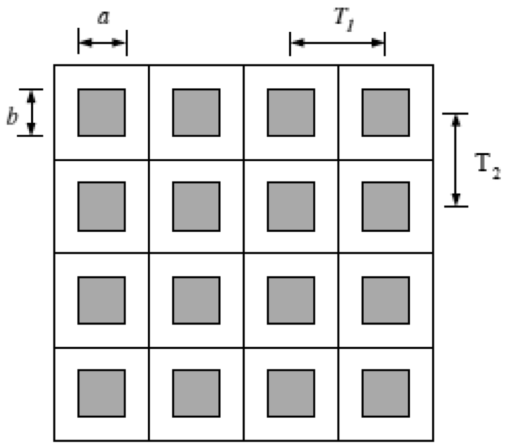 In this paper, we consider an IR system with a uniform rectangular detector array, which is illustrated in Figure 1, where a and b are the active region dimensions measured in millimeters (mm) and T1 and T2 are the horizontal and vertical sample spacings. The shaded areas represent the active region of each detector. In this case, the detector model PSF is given by [9]: