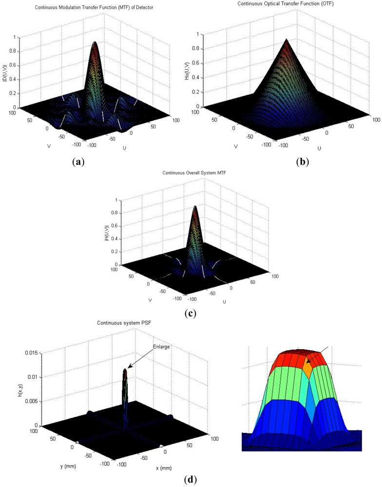 We consider a particular IR imaging system as an example; the typical system considered is the forward-looking infrared (FLIR) imager. In order to make our adopted PSF realistic, parameter settings of this PSF are the same as in [8]. This system has square detectors of size a = b = 0.040 mm, the imager is equipped with 100 mm f/3 optics, the center wavelength = 0.004 mm and the cutoff frequency 83.3 cycles/mm is used for the OTF calculation. In Figure 2, Figure 2(a) shows the effective MTF of the detectors, |D (u, v)|, and Figure 2(b) shows the diffraction-limited OTF for the optics, H (u, v). The overall system MTF is shown in Figure 2(c), and the continuous system PSF is shown in Figure 2(d).