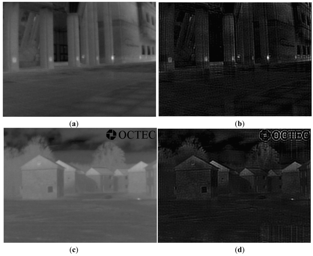Generally speaking, if only IR images are available, we can use the same parameter settings to complete the proposed three-step framework (without registration) and obtain similar blended results as those of available EO images. However, the detected edge of an object, such as the edge of its shadow area rather than the real object, is not accurate, and it is impossible to detect the shape of smoke (gas) only based on the original IR image only (see results of “OCTEC” image).
