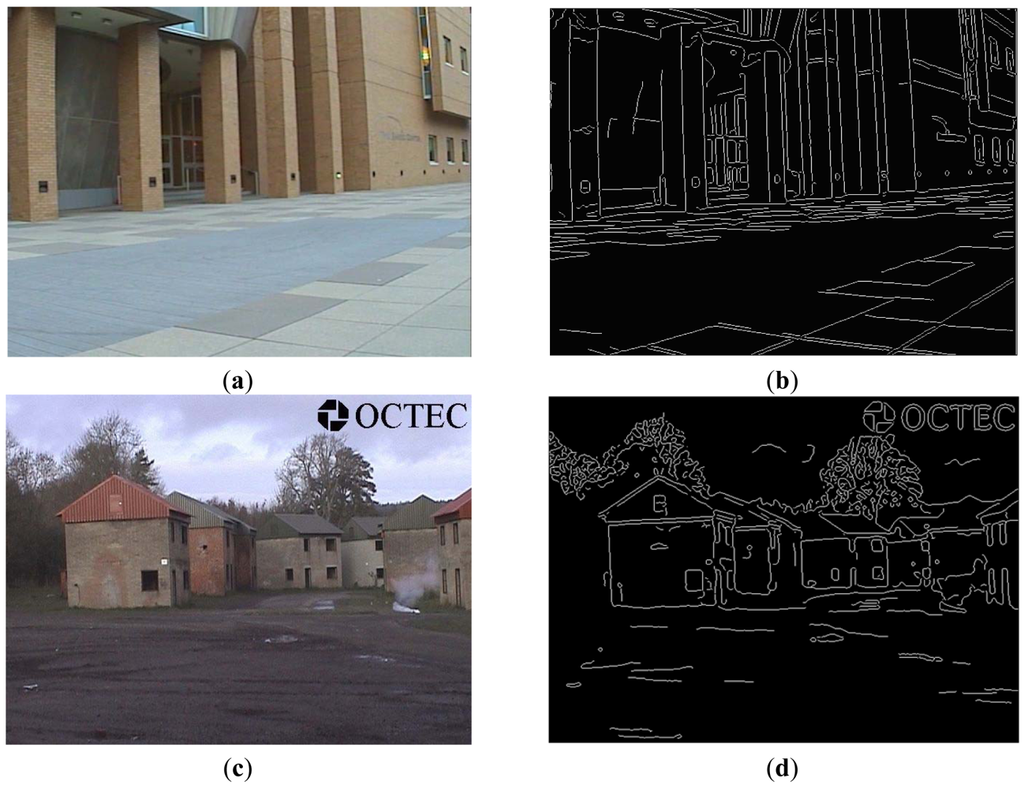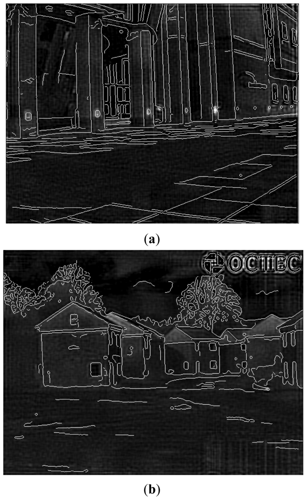 Figure 4 shows two edge detection results of EO images via the Canny edge operator, where sigma = 1, T1 = 0.04 and T2 = 0.09. Observed from the obtained results, we can find out that the edge-detected images are clean, and results cover all main edges of objects in original EO images.