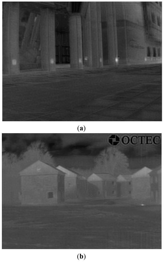 If we have both EO and IR images, there is no “false alarm”. However, if only IR images are available, sometimes there are “false alarms”. For example, if we have both EO and IR images, we could blend the edge of the house (Figure 4(d)) rather than its shadow area onto the transformed IR images. Therefore, there is no false alarm. On the contrary, if only IR image is available, the blended edge is the shadow area of a house (Figure 4(e)) instead of the house itself. Obviously, this is a false alarm. The extraneous pattern means effects in fused images are not caused by objects appeared in these images. For example, the shadow area of the house is generated by sunlight (not appear in the image) rather than the house itself. Therefore, we regard the shadow area as a kind of extraneous pattern. By contrast, smoke in the EO Image 2 is generated by fire (light point) appeared in the EO image, thus smoke cannot be accounted as an extraneous pattern.